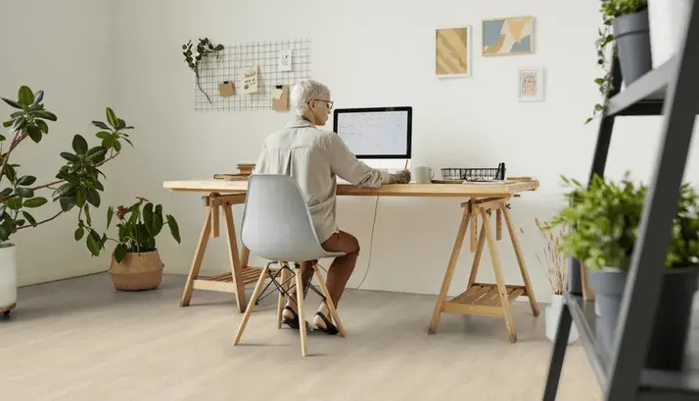W domowym biurze liczy się zarówno jego funkcjonalność, jak i atmosfera sprzyjająca skupieniu. Podłogi Gerflor łączą elegancję naturalnych dekorów z trwałością, której wymaga codzienna praca przy komputerze. Odporność na krzesła obrotowe, stabilność i łatwość pielęgnacji sprawiają, że to idealny wybór do pracy zdalnej. Jasne drewna dodają lekkości, ciemne wprowadzają spokój, a struktury betonu dodają nowoczesności — wszystko zależy od stylu pracy i osobistych preferencji. Akustyka LVT redukuje hałas, tworząc warunki, które sprzyjają efektywności i komfortowi.