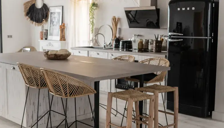 Meble... Podstawowe tekstury są popularne! Drzewo, dzięki swojemu naturalnemu charakterowi, pozostaje ulubionym materiałem stylu etnicznego. Faworyzuje się również elementy zawierające więcej odcieni i bardziej lub mniej widoczne nierówności, które sprawiają wrażenie, że przedmiot został wyrzeźbiony w kawałku kory. W ten sam sposób wiklina, ratan i inne włókna roślinne są materiałami, z których wykonuje się fotele i doniczki, bez ich uprzedniego farbowania. Wnętrze etniczne potrzebuje jednak akcentu metalowego. Szafka ścienna, oparcie kanapy... Jeden element wystarczy, aby dodać do tego egzotycznego wnętrza temperament czarnego metalu.