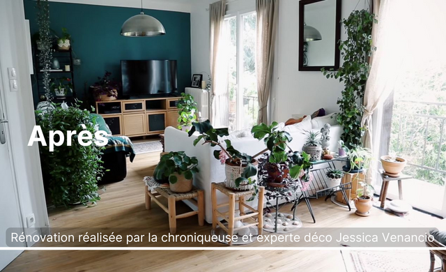 Jessica przekształciła ten salon w małą przystań spokoju, podkreślając jednocześnie piękne rośliny właściciela.