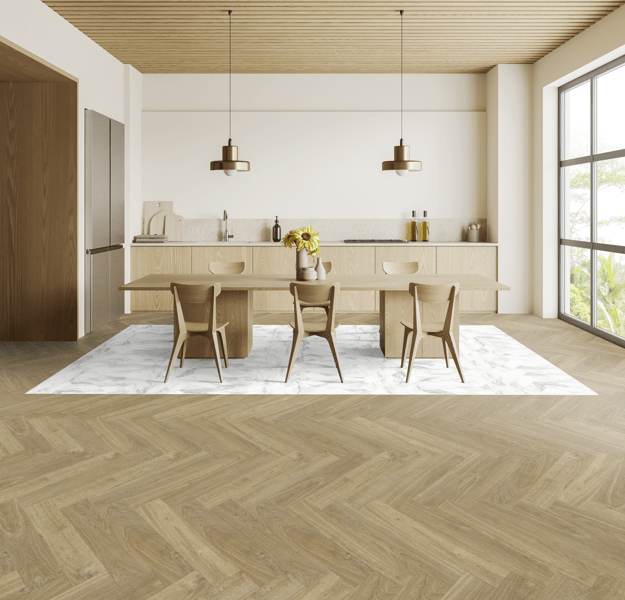 Gdy mamy otwartą przestrzeń w domu często zdarza się, że nie chcemy jednorodnej powierzchni na podłodze i szukamy możliwości łączenia różnych dekorów w jednej przestrzeni. Trend floor to floor polega na komponowaniu kilku stylów podłogi w ramach jednej podłogi – nie jako przypadkowe zestawienie, lecz jako narzędzie do wizualnego wydzielania funkcjonalnych stref: strefy dziennej, jadalnej, pracy, relaksu czy wejścia